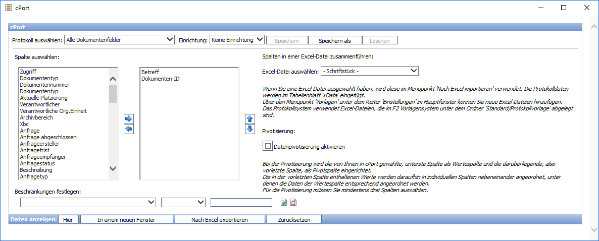 F2 cPort ist ein Analysewerkzeug für Administratoren in F2. Mit F2 cPort können Administratoren Daten aus F2 extrahieren und auf deren Grundlage Berichte erstellen.